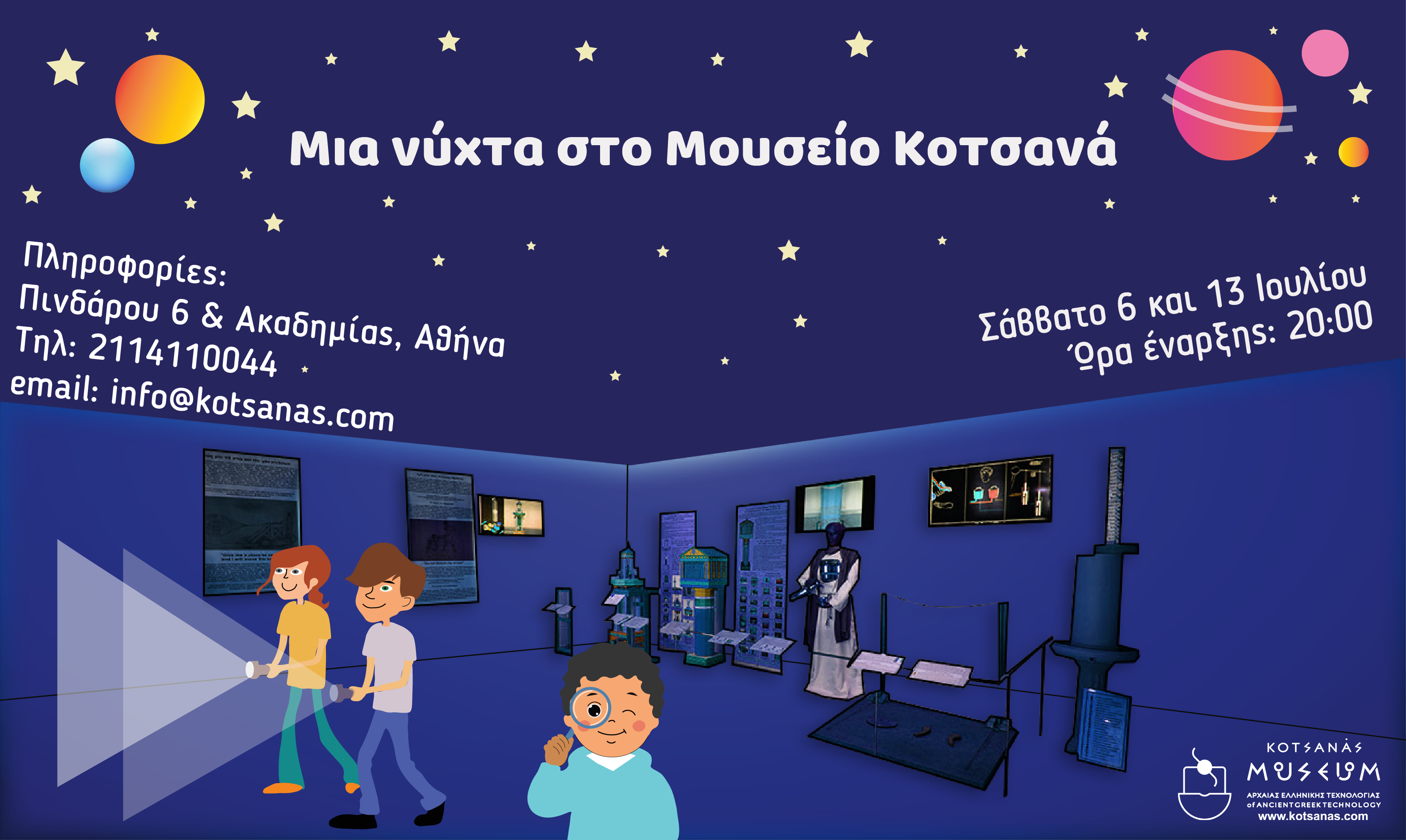 Το Μουσείο Κοτσανά – Αρχαίας Ελληνικής Τεχνολογίας, καλεί τους μικρούς του φίλους, από 6 έως 12 ετών, να περάσουν μία ολόκληρη νύχτα στο Μουσείο και να νιώσουν αρχαίοι Έλληνες μέσα από πρωτότυπες δημιουργικές δράσεις που θα τους συναρπάσουν το Σάββατο 6 και 13 Ιουλίου 2024.