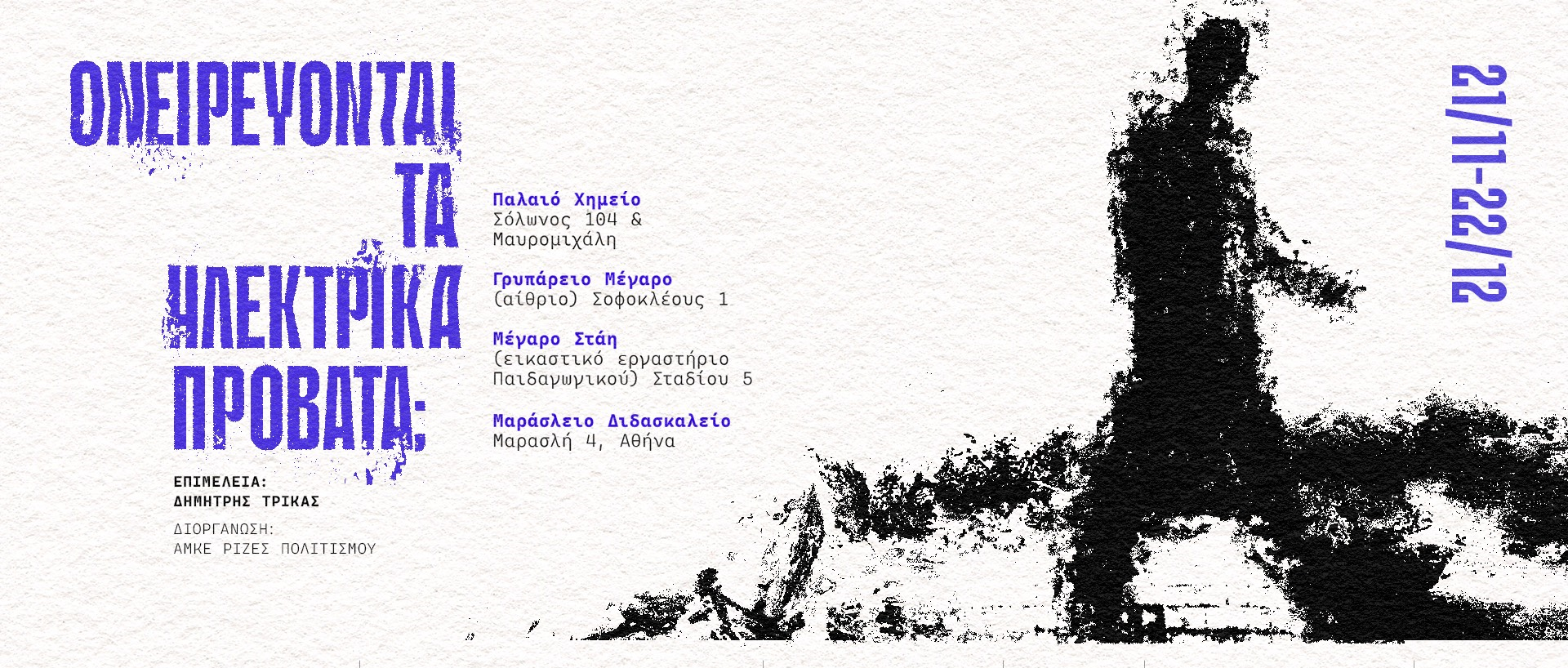 Εικαστική έκθεση με τίτλο “Ονειρεύονται τα ηλεκτρικά πρόβατα; η Ανθρώπινη κατάσταση στην εποχή της Τεχνητής Νοημοσύνης” παρουσιάζεται σε τέσσερις χώρους του κέντρου της Αθήνας: το Παλαιό Χημείο, το Μαράσλειο Διδασκαλείο, το Μέγαρο Στάη και το Γρυπάρειο Μέγαρο και φιλοξενεί τα έργα 55 καλλιτεχνών και καλλιτεχνικών ομάδων, τα οποία συμπληρώνονται από ένα δυναμικό δημόσιο πρόγραμμα που περιλαμβάνει performances, μουσικά δρώμενα και στρογγυλά τραπέζια με περί τους 50 ομιλητές και ομιλήτριες από τις 21 έως και τις 22 Νοεμβρίου 2024.