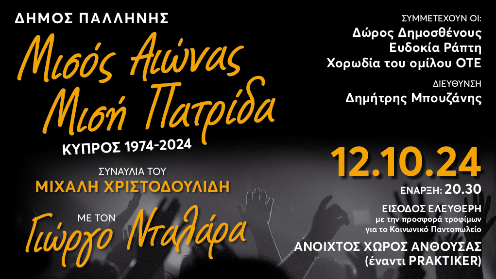 Με τη συμπλήρωση 50 χρόνων από την Τουρκική εισβολή και τη συνεχιζόμενη κατοχή του 36 τοις εκατό της Κύπρου, ο Δήμος Παλλήνης θα πραγματοποιήσει συναυλία με τίτλο 1974-2024 Μίσος αιώνας – Μισή πατρίδα στις 12 Οκτωβρίου.