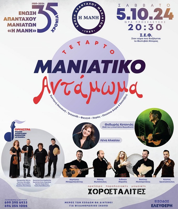 Η Ένωση Απανταχού Μανιατών «Η Μάνη» γιορτάζει 35 χρόνια από την ίδρυσή της και σας προσκαλεί στο 4o Μανιάτικο Αντάμωμα το Σάββατο 5 Οκτωβρίου 2024 και ώρα 20:30 στο Στάδιο Ειρήνης & Φιλίας στον Χώρο Δ (εκεί που διοργανώνεται το Φεστιβάλ Μπύρας).