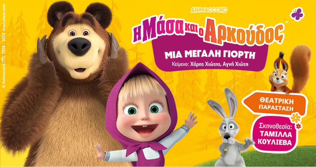 «Η Μάσα και ο Αρκούδος, μια μεγάλη γιορτή» η επίσημη θεατρική παράσταση, ζωντανεύει τον μαγικό κόσμο της παγκόσμιας επιτυχημένης σειράς κινουμένων σχεδίων, με τα αυθεντικά κοστούμια του εξωτερικού μέχρι τις 15 Σεπτεμβρίου 2024.