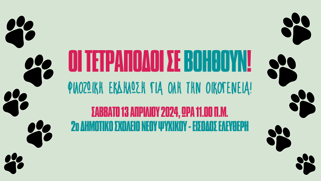 Το Σάββατο 13 Απριλίου και ώρα 11.00 δίνουμε όλοι ραντεβού στον προαύλιο χώρο του 2ου Δημ. Σχολείου Νέου Ψυχικού, 25ης Μαρτίου 2 (Είσοδος ελεύθερη). Με γνώμονα το σύνθημα “Μαζί Μπορούμε περισσότερα, μαζί μπορούμε καλύτερα!” ο Δήμος Φιλοθέης-Ψυχικού συνδιοργανώνει με τον Μορφωτικό Εξωραϊστικό Όμιλο Νέου Ψυχικού και την Ζωοφιλική Ένωση Ψυχικού, μια εκδήλωση για όλη την οικογένεια.